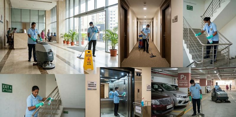 Cleaning of lobbies, corridors, stairways, elevators, and parking lots.